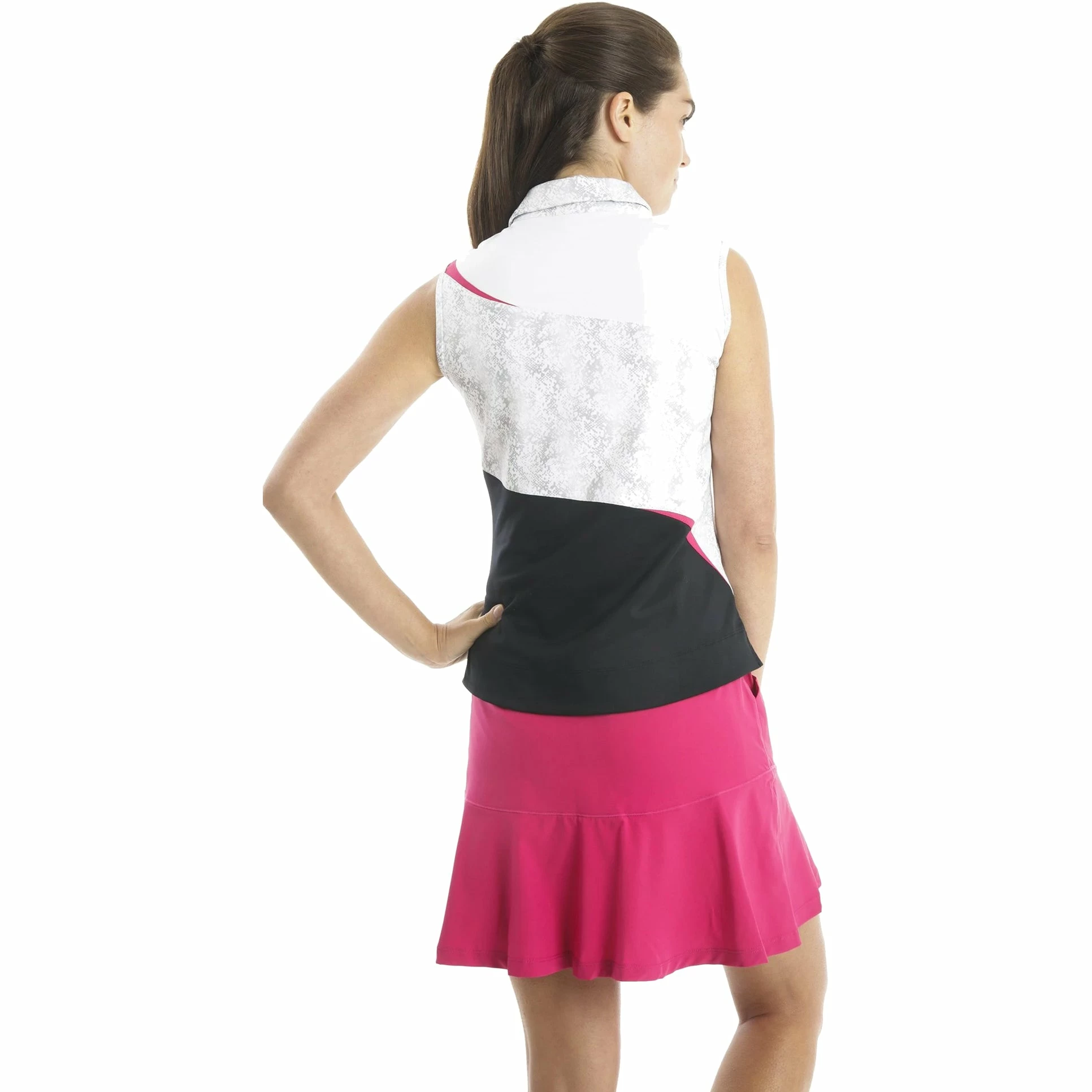 Look stylish in the Chase54 Charmer Sleeveless Polo. This polo is built with DRYFUZE which is moisture wicking to pull sweat away from the body and keep you dry and comfortable. There is a UPF 50+ sun protection rating that keeps you protected from the harmful UV rays of the sun and the zip top and colorblock print add style to this polo.